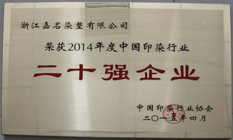 浙江嘉名染整有限公司獲“2014年度中國印染行業(yè)企業(yè)20強”